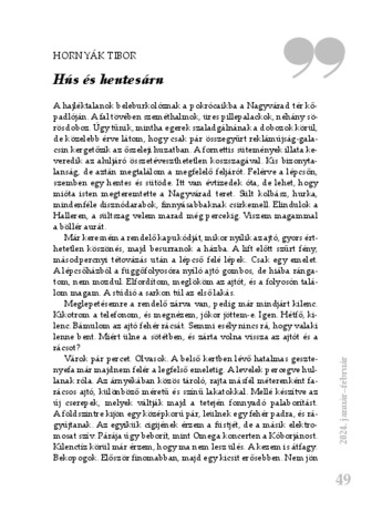 Hornyák Tibor: Hús és hentesáru ; Gesztenyés : [elbeszélés]. Tiszatáj, (78) 1-2. pp. 49-51. (2024)