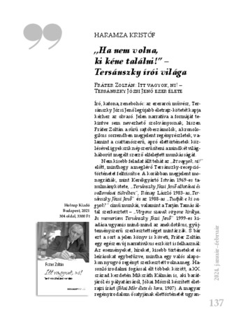Haramza Kristóf: "Ha nem volna, ki kéne találni!" - Tersánszky írói világa - Fráter Zoltán: Itt vagyok, ni! : Tersánszky Józsi Jenő ezer élete : [könyvismertetés]. Tiszatáj, (78) 1-2. pp. 137-141. (2024)