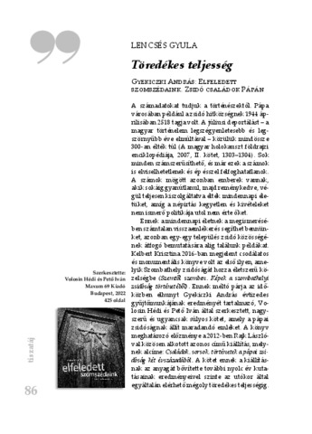 Lencsés Gyula: Töredékes teljesség - Gyekiczki András: Elfeledett szomszédaink: zsidó családok Pápán : [könyvismertetés]. Tiszatáj, (78) 3. pp. 86-90. (2024)