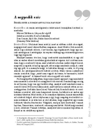 Kulcsszavak: Irodalomtudomány - antológia - interjú, Román irodalom története - antológia - beszélgetés, Karádi Éva, Demény Péter, Csordás Gábor, Király Edit, Bombitz Attila, Deczki Sarolta, Orcsik Roland, Mészáros Tünde, Rajsli Emese, Koszta Gabriella, Medve Zoltán