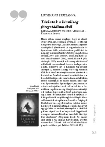 Luchmann Zsuzsanna: Távlatok a kívüliség féregstádiumából - Miklya Luzsányi Mónika: Vérvonal - Étienne könyve : [könyvismertetés]. Tiszatáj, (78) 8. pp. 83-89. (2024)